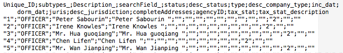In order to use the data directly, we have to first familiarise ourselves with their content and format. ICIJ download includes 4 data files and a “readme” document, describing the data. The data depict a network of relationships between individuals and offshore corporations. Each individual, corporation and relationship has been assigned an unique ID number for the purpose of keeping track of them. Each has several attributes. For example, an individual has a name, a function he or she fulfils (master client, officer, etc.) and an address. A corporation would have a name, an address and additional information about its tax status, jurisdiction, whether it’s still active etc.